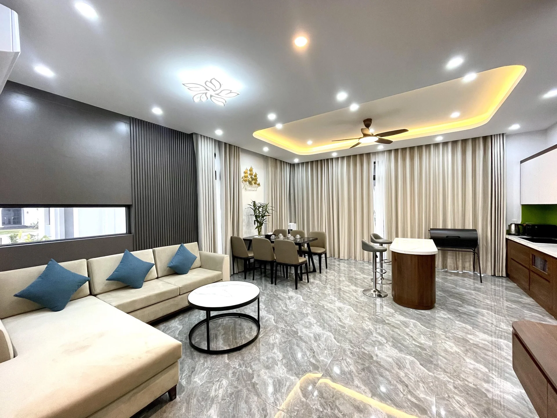 + Phòng khách có sofa lớn, bộ loa karaoke di động và màn hình TV 50 inch xịn sò.
