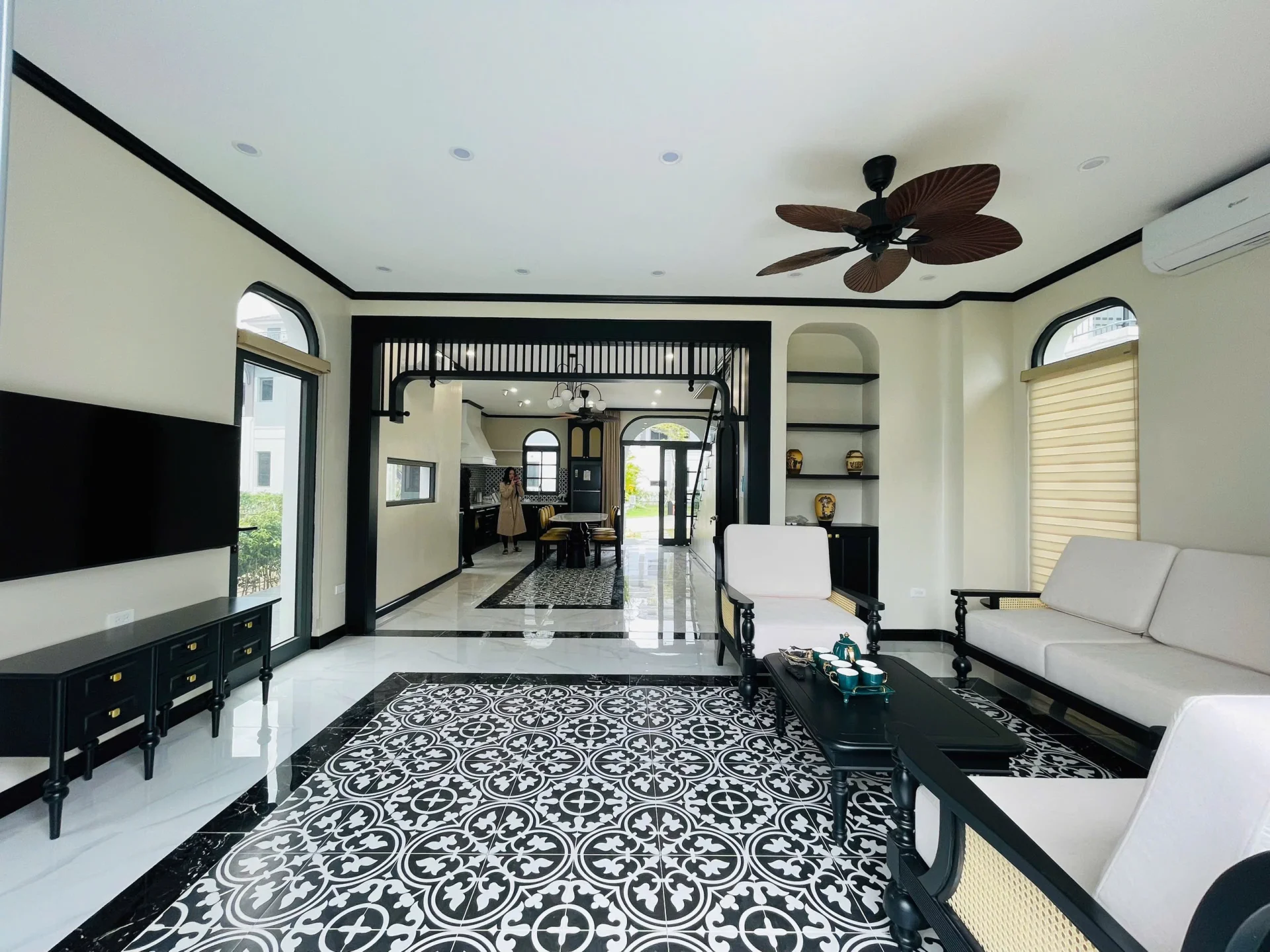 + Phòng khách với sofa rộng, được lắp đặt trang thiết bị hiện đại như tivi 4k với màn 50inch đẳng cấp.